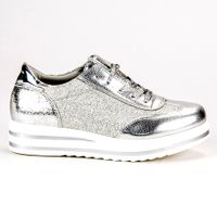 Szare, błyszczące sneakersy na platformie o wysokości 3,5cm. Wierzchnia część wykonana jest z materiału tekstylnego z wstawkami w srebrnym kolorze ze skóry z wężową fakturą. Buty odpowiednie do codziennych stylizacji w sportowym stylu. Sprawdzą się o każdej porze roku. Będą doskonałe, jako buty zmienne.