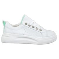 SHELOVET Modne Trampki Na Platformie białe to damskie obuwie sportowe, które zostało wykonane z materiału skóropodobnego. Buty są koloru białego, nie posiadają żadnych dodatkowych zdobień. Mają one 4,5 centymetrową platformę. Podeszwa jest wykonana z materiału syntetycznego. Są to buty przeznaczone do noszenia wiosną i latem.