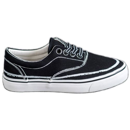 Trampki z materiału tekstylnego w czarnym kolorze to wygodne obuwie damskie na co dzień. Cholewki mają ozdobny biały nadruk imitujący przeszycia, dzięki czemu buty te nabierają ciekawego charakteru i będą świetnym uzupełnieniem różnych stylizacji. Platformy o wysokości 2 cm gwarantują wygodę przy chodzeniu.