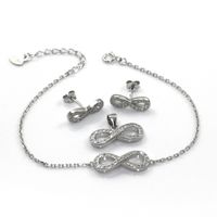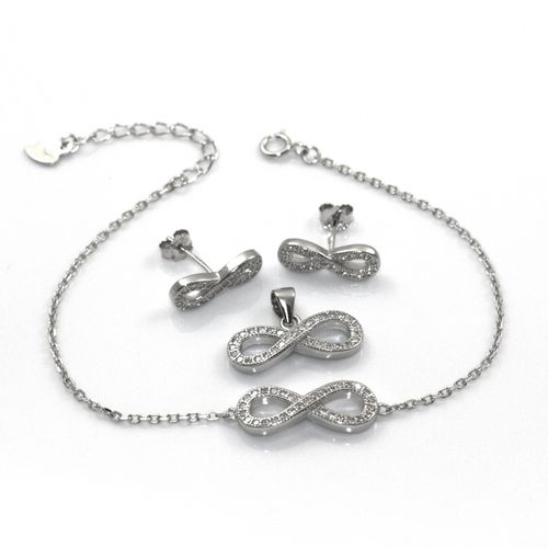 Modny komplet biżuterii ze znakiem Infinity nieskończoność- wisiorek, kolczyki i bransoletka- wykonany z rodowanego srebra najwyższej próby 925.