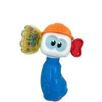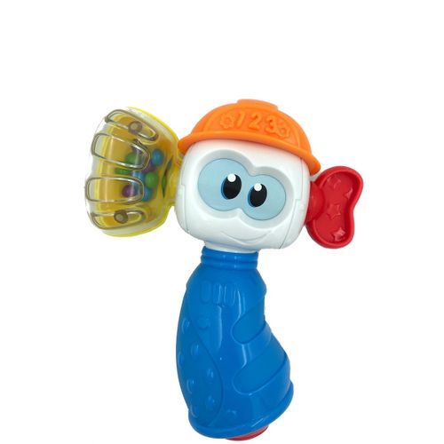 Młotek grzechotka ma ruchome elementy. Przekręcające się ucho, wydaje mechaniczne dźwięki i zmienia wyraz oczu. Umieszona w dolnej części kuleczka, obraca się zmieniając kolory i tekstury. Przy potrząsaniu zabawką kolorowe kuleczki grzechoczą.