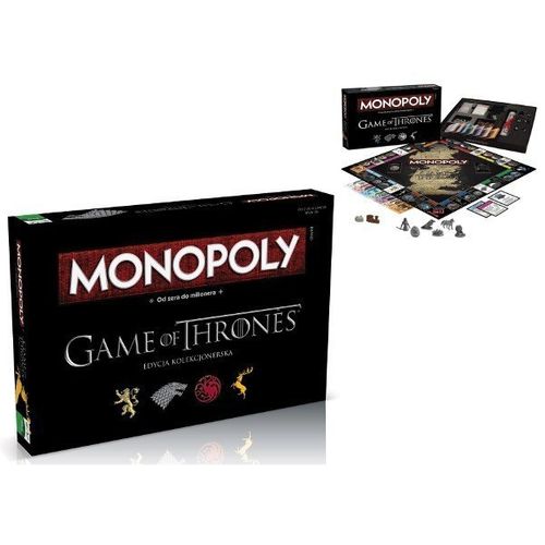 Najnowsza kolekcjonerska edycja Monopoly od Winning Moves przenosi nas w świat znanego na całym świecie serialu HBO bazującego na powieści – „Gra o Tron”. Gra ta znana jest praktycznie wszystkim na całym świecie, a zasady gry są bardzo proste. To idealny prezent dla każdego fana Gry o Tron i nie tylko! Plansza gry przedstawia serialowy świat czyli Westeros. Na tradycyjnych polach nieruchomości mamy zamki i miasta takie jak Winterfell, Czarny Zamek, Quarth czy Królewską Przystań. Popularne koleje zamieniają się w domy rodów: Starków, Lanisterów, Baratharionów i Targarianów. Na kartach Valar Morghulis czy Żelażny Tron możemy spotkać cytaty z książki „On nie był żadnym smokiem, ogień nie zabija smoka”.