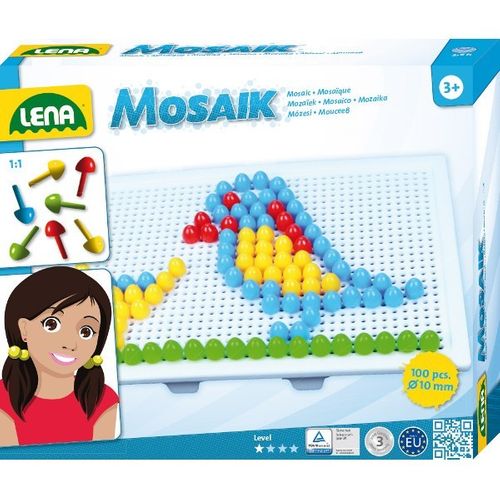 Mozaika zawiera 100 kolorowych kołeczków o średnicy 10 mm. W skład zestawu wchodzi także perforowana płyta: 21 x 16 cm. Zabawka poprawia umiejętności twórcze i motoryczne. Nadaje się dla dzieci od 3 lat. Wyprodukowana w Europie.