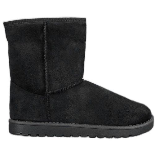 Mukluki w czarnym kolorze to ciepłe buty, które sprawdzą się podczas chłodniejszych dni. Mają one solidne podeszwy z platformą o wysokości 2 cm, która stanowi świetną izolację od podłoża, a ich cholewki wykonane z ekologicznej skóry zamszowej sięgają za kostkę i można je wywinąć odsłaniając futerko.