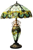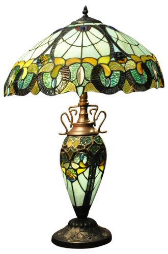 Piękna duża lampa witrażowa tiffany z podświetlanym witrażem i metalową podstawą. Składa się z pięknego wielobarwnego odcienia witraży, który dominuje głównie w kolorze niebieskim i zielonym. Cień ma 45 cm średnicy i wysokość 30 cm. Podstawa składa się z metalowego stojaka z witrażowym korpusem, który jest również niebieski i zielony, aby pasował do cienia. Baza jest podświetlona dla dodatkowego efektu. Podstawa mierzy 16 cm, a wysokość 44 cm. Całkowita wysokość lampy wynosi 68 cm. Wymagane są 3 żarówki o rozmiarze E27 max 60W.