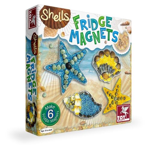 Opakowanie zawiera materiały, dzięki którym można wykonać 6 magnesów: muszelki, kolorowy piasek, namagnesowaną kartkę, klej oraz szablony w kształcie muszli.
