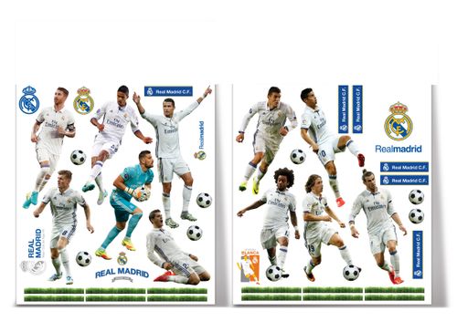 Zestaw fantastycznych naklejek Real Madryt. Doskonałe do udekorowania ściany, biurka czy komody. Szybko i w bardzo prosty sposób zmienisz wizerunek dowolnej rzeczy naklejając wzór z popularnego klubu piłkarskiego. Komplet składa się z dwóch arkuszy z różnymi naklejek. Oryginalny pomysł z pewnością ucieszy każdego kibica.