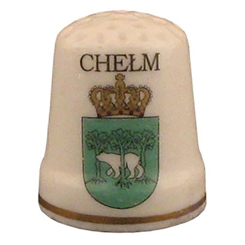 Naparstek ceramiczny z nadrukowanym herbem miasta Chełm.