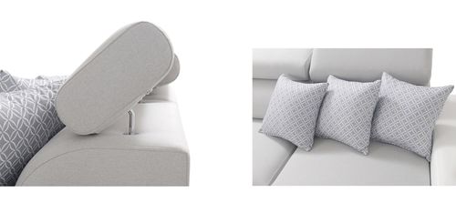 Narożnik na zdjęciu prawostronny, wykonany z IV grupy tkanin - luxo, w połączeniu z białą ekoskórą.