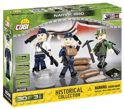 Zestaw zawiera 30 elementów wysokiej jakości oraz 3 figurki żołnierzy jednostek niemieckich, którzy brali udział w bitwie o Narwik 1940 roku.