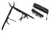 Jedyne czego potrzebuje to Twoich zręcznych rąk. Dopracowane rozmieszczenie wszystkich elementów zapewnia łatwy dostęp do narzędzi oraz pewny i wygodny chwyt podczas użytkowania. Dzięki rozlokowaniu narzędzi na zewnętrznej stronie multi toola są one łatwo dostępne, zaś ostrza mogą być wygodnie użytkowane na całej swej długości. Kombinerki Stosunkowo wąskie kombinerki wyposażone w przecinak do kabli, doskonale sprawdzają się podczas różnych (w tym precyzyjnych) prac. Wygodne, ergonomiczne rączki o zaokrąglonych brzegach wygodnie leżą w dłoni podczas pracy. Pozostałe narzędzia ukryte są od wewnętrznej strony rączek. Bity Multitool SKILL wyposażony jest w uchwyt, przedłużkę oraz 9 najpopularniejszych bitów (końcówek śrubokrętowych) o rozmiarach: płaskie – 7, 5, 3 ; krzyżakowe (philips) – PH3, PH2, PH1; Imbusowe H5, H4, H3 Bity umieszczone są na wygodnej gumowej „szynie” dzięki temu łatwo je wyjąć z pochwy i utrzymać we właściwym porządku. Dzięki funkcjonalnemu rozlokowaniu narzędzi Multi tool SKILL może być używany w charakterze śrubokręta, jak i klucza. (uchwyt bitów można ustawić pod kątem 90 st do rączki). Wykorzystanie ogólnodostępnego typu bitów pozwala używać również innych, potrzebnych, a nie zamieszczonych w zestawie końcówek śrubokrętowych, oraz kluczy nasadowych typu 3/8″. Ostrza Dwa wygodne, klasyczne ostrza ze stali 420 ( składany nóż o wymiarach 70 x 10 mm) i (ostrze 40 x 5 mm), oba otwierane klasycznie. W nożach, jak i pozostałych (poza korkociągiem i uchwytem na bity) narzędziach znajdują się niewielkie wgłębienia ułatwiające wyciągnięcie ostrza (bądź innego wybranego narzędzia). Pełne otwarcie potwierdzone jest charakterystycznym kliknięciem sprężyny. Piłka 8 cm ząbkowanego ostrza doskonale sprawdza się przy cięciu lin, drewna a także… przy sprawianiu ryb. Otwieracz Jeden, ale opracowany tak by można było nim wygodnie otwierać zarówno puszki jak i butelki. Możliwość wycinania cienkiej blachy pozwala przerabiać np. puszki na wiele innych, często zaskakujących przedmiotów. Nożyczki Małe nożyczki do cięcia takich materiałów takich jak papier, dzianina, skórki itd. Ich wartość staje się szczególnie cenna, gdy należy przyciąć… zadarty paznokieć. Korkociąg Klasyczne urządzenie do wyciągania korków potrzebne zwłaszcza podczas romantycznego pikniku. Miarka Po obu stronach rączek znajduje się poręczna miarka. Po jednej stronie kalibrowana w cm (22,5 cm) po drugiej w calach (8 cali). Lewarek Krótka 4 cm dźwigienka pomaga podważyć wieko np.puszki, może pełnić również rolę płaskiego śrubokręta. Bywa ona użyteczna w miejscach trudno dostępnych dla śrubokrętów z długą rączką. Przelotka na linkę Wygodne, stalowe oczko umieszczone za korkociągiem pozwala zabezpieczyć mutli tool np. linką przed przypadkowym zgubieniem. Pochewka Multitool SKILL posiada pochewkę z dwiema kieszeniami, będąca w zestawie, pozwala wygodnie zamocować go na pasku, tak by narzędzie znajdowało się zawsze „pod ręką”. Kieszeń zewnętrzna – łatwiej dostępna przeznaczona jest na multi tool, wewnętrzna zaś na szynę z bitami.