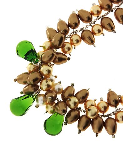 Interesujący naszyjnik wykonany z oryginalnych, certyfikowanych elementów Swarovskiego: pereł okrągłych i podłużnych w odcieniu jasno i ciemno złocistym, oraz z najwyższej próby srebra 0.925. Środek zdobi dodatkowo kilka pereł barwy ecru oraz trzy wspaniałe kryształy w kolorze szmaragdów.