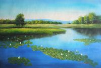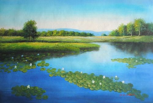 Niepowtarzalny obraz olejny o przyjemnych barwach oraz oryginalnej stylistyce malarskiej! Obraz przedstawia pejzaż z nenufarami. Charakteryzuje się subtelnością i delikatnością oraz niezapomnianą scenerią krajobrazową!