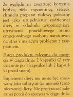 Zalecana do spożycia dzienna porcja produktu (2 kapsułki) zawiera: Ekstrakt z korzenia Kozłka 350mg, ekstrakt z ziela Męczennicy 70mg, sproszkowane szyszki Chmielu 280mg.