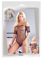 Crotchless, transparent body made out of soft stretchy net with short sewn-on sleeves. With an off-the-shoulder Carmen neckline and elegant lace borders on the neckline, sleeves and around the legs.