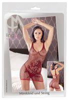 The mini dress is made out of stretchy net material and seamless. There is a sewn-on tendril pattern at the front. The back has a hole and allows cheeky glimpses. Straps and hem are also stretchy. Includes a lace string. Red. 90% polyamide, 10% spandex.