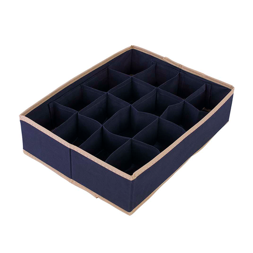 Organizer do szuflady z szesnastoma przegródkami. Wykonany z „oddychającej” TKANINY, przepuszczającej powietrze i łatwej do czyszczenia. Ścianki boczne usztywnione tekturą, po obu stronach obszyte tkaniną. Górna i dolna krawędź dodatkowo wzmocnione taśmą, zabezpieczającą przed uszkodzeniem. Można go wstawić do szuflady lub postawić w szafie na półce. Idealny do przechowywania drobnych rzeczy, takich jak paski, krawaty czy bielizna.