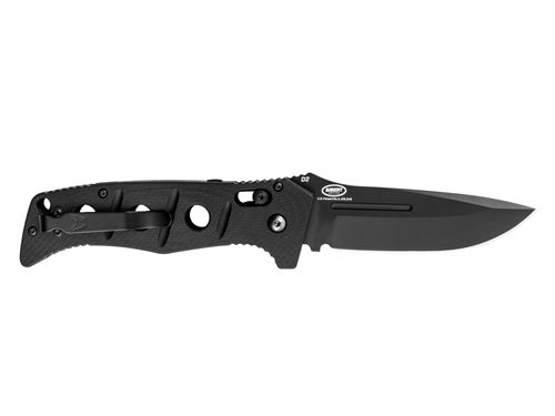 Nóż Benchmade model 2750BK AUTO Adamas to nóż składany typu automat utrzymany w militarnym klimacie czarnej serii Benchmade. Jego autorem jest znany knife-maker Shane Sibert, którego interesujące projekty noży spotkały się z ogromnym uznaniem na całym świecie. Klinga noża została wykonana ze stali D2, którą producent zahartował do wartości 60-62HRC. Dzięki tak dobranym parametrom uzyskujemy wysoką odporność na ścieranie i długie trzymanie ostrości bez częstego ostrzenia. Aby zabezpieczyć klingę producent zastosował powłokę w kolorze czarnym, która dodatkowo podkreśla klimat noża. Dzięki zastosowaniu mocnej sprężyny, ostrze błyskawicznie rozkłada się i jest gotowe do użycia w każdej wymagającej sytuacji. Rękojeść noża to połączenie okładzin wykonanych z materiału G10 i stalowych przekładek , które wzmacniają i stabilizują konstrukcję noża. Odpowiednie podcięcia oraz profilowanie rękojeści zapewniają wygodę podczas operowania nożem w najbardziej wymagających warunkach. Otwarta konstrukcja modelu 2750BK Adamas pozwala na jego łatwe utrzymanie w czystości. Nóż wyposażony jest w klips ułatwiający jego przenoszenie, a dodatkowo do modelu firma Benchmade dokłada pochewkę wykonaną z cordury. Zastosowana blokada to lubiany i solidny system "Axis Lock".