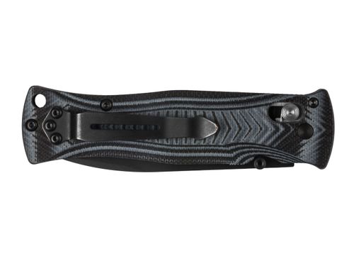 Płaski profil rękojeści wykonano z kompozytu G10. Okładziny poddano odpowiedniemu teksturowaniu co zapewnia interesujący wygląd oraz pozytywną ergonomię chwytu. Otwór w rękojeści pozwala przewlec linkę, a przekładalny klips ułatwia przenoszenie noża. Mechanizm blokujący ostrze to trwały i mocny "AXIS lock", którego elementem blokującym jest oś wchodząca w wycięcie w głowni. Blokada ta jest łatwa dla obsługi osób prawo i lewo ręcznych.