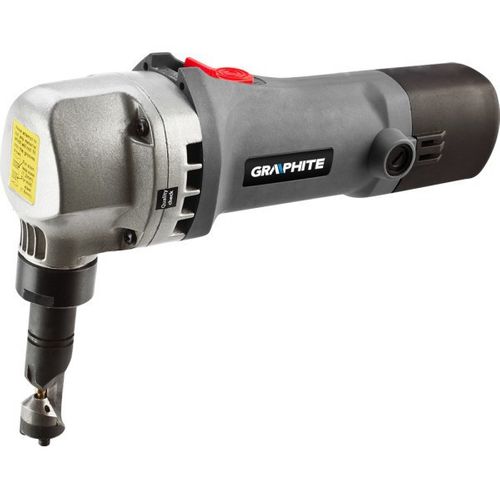 Wysokiej klasy nożyce do blachy GRAPHITE o mocy 500 W, przeznaczone do przecinania blachy prostej, falistej i trapezowej po linii prostej oraz do wycinania krzywizn. Przy pomocy nożyc można przecinać stal o maksymalnej grubości 1,6 mm oraz aluminium o grubości do 2,5 mm. Nożyce tnąc wycinają pasek o szerokości 5 mm. Minimalna średnica otworu startowego wynosi 22 mm.