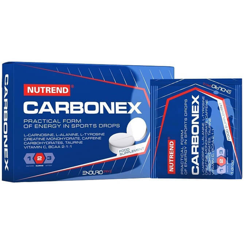 Nutrend - Carbonex - tabletki energetyczne z dodatkiem substancji energizujących i stymulujących – kofeiny, tauryny, magnezu, witaminy C, L-karnozyny, L-alaniny oraz BCAA w proporcji 2:1:1. Przewaga szybkiej energii w postaci węglowodanów prostych. Efekt działania wzmacnia rozpuszczenie tabletki w ustach i wchłonięcie substancji aktywnych przez błonę śluzową.