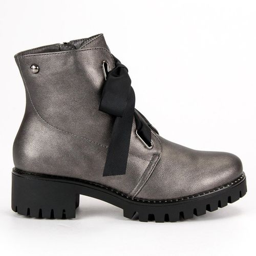 Ocieplane workery Filippo to buty jesienno-zimowe na średniej wielkości, grubym obcasie. Są sznurowane za pomocą szerokiej, nietypowej sznurówki. Posiadają bardzo grubą, solidną podeszwę, która zagwarantuje komfort chodzenia nawet na śliskich powierzchniach. Mają bardzo ładny srebrny kolor. Są to buty na co dzień.