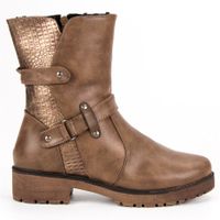 Ocieplane botki workery to buty ze skóry ekologicznej w kolorze jasnobrązowym, a tylna część wysokiej na dziewiętnaście centymetrów cholewki pokryta jest pięknym wzorem. Futerko pokrywa wnętrze buta. Zrobiono z niego nie tylko ocieplenie, ale i wkładkę. Obcas jest płaski i praktyczny zimą i jesienią.
