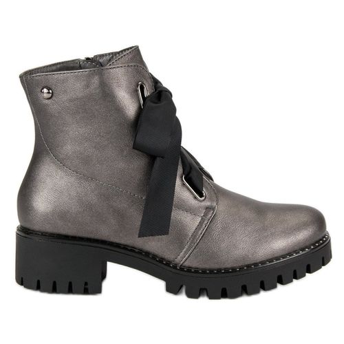 Ocieplane workery Filippo to buty jesienno-zimowe na średniej wielkości, grubym obcasie. Są sznurowane za pomocą szerokiej, nietypowej sznurówki. Posiadają bardzo grubą, solidną podeszwę, która zagwarantuje komfort chodzenia nawet na śliskich powierzchniach. Mają bardzo ładny srebrny kolor. Są to buty na co dzień.