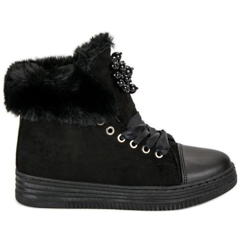 Czerń to kolor idealny na jesień i zimę, lecz te trampki to buty idealne jeszcze z innych powodów jak na przykład: wystające na zewnątrz dość grube ocieplenie, koraliki zamocowane z przodu buta, szare sznurowadła, wysoka podeszwa z bieżnikiem czy pełny nosek. Ocieplenie, jak i wkładka jest z futerka.
