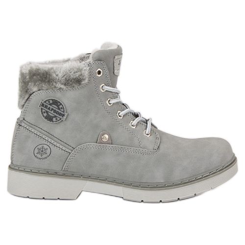 American Club Szare Ocieplane traperki to buty dla kobiet na sezon jesienno-zimowy, które idealnie sobie poradzą z niskimi temperaturami oraz złymi warunkami atmosferycznymi. Wykonano je ze skóry ekologicznej. Posiadają podeszwę z bieżnikiem z tworzywa sztucznego oraz wkładkę i ocieplenie z futerka.