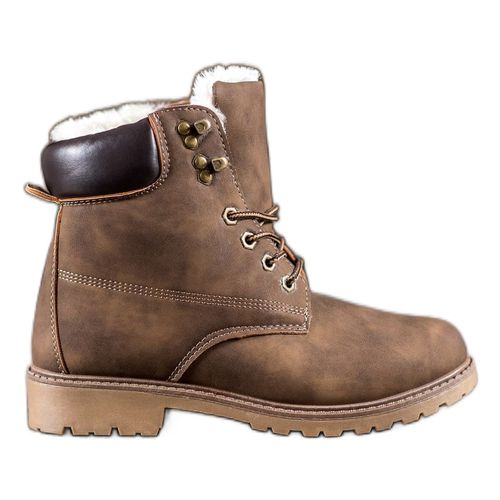 Damskie traperki ocieplone mięciutki futerkiem, to idealne obuwie na chłodniejsze dni, pasujące do wielu różnych stylizacji na co dzień. Buty te są wykonane z ekologicznej skóry w brązowym kolorze, mają szeroki obcas o wysokości 3 cm, zaokrąglone noski, cholewki sięgające za kostkę i wygodne wiązanie na sznurówki.
