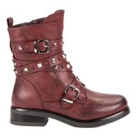 Czerwone damskie workery na niewielkim, dyskretnym obcasie, zyskują rockowy charakter za sprawą pasków z klamrami i srebrnymi wypukłymi dżetami. Buty sprawdzą się w chłodne dni, ponieważ zostały ocieplone futerkiem. Podeszwa jest fachowo wyprofilowana, a noski uniesione ku górze, by zapewnić komfort stopy.