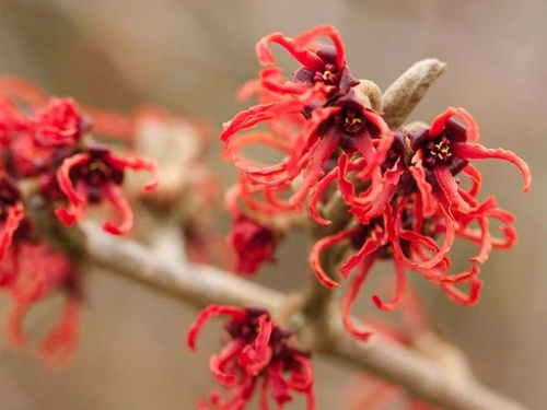 Krzew o regularnym, zaokrąglonym pokroju, osiągający około 3 m wysokości. Liście ciemnozielone, ziarniste, do 10 cm długości, jesienią wybarwiające się na kolor żółty, pomarańczowy i czerwony. Kwiaty czerwone z fioletowym kielichem, zebrane w pęczki, z frędzelkowatymi płatkami, wytrzymują spadki temperatur nawet do -6 st. C. Kwitnie zimą i wczesną wiosną, w lutym i marcu. Kontrastowe kwiaty pokryte śniegiem lub szronem stanowią niezwykłą ozdobę na tle zimowego krajobrazu.