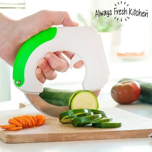Tnij w wygodniejszy sposób dzięki okrągłemu nożowi Chop & Roll! Dzięki jego innowacyjnemu projektowi, niniejszy praktyczny wynalazek umożliwia szybkie oraz bezpieczne cięcie i krojenie w kawałki. W celu zapewnienia wygodniejszego cięcia, w zależności od produktów spożywczych i potrzeb, ostrze może się toczyć lub pozostać w miejscu (posiada dźwignię w celu jej zamocowania). Idealny do warzyw, tatara, cienkich filetów, itd.