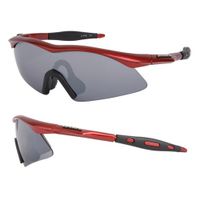 Przeciwsłoneczne okulary sportowe. Przeznaczone dla dzieci i osób o szczupłej twarzy. Wytrzymałe oprawki wykonane z poliwęglanu. Bezodpryskowe soczewki poliwęglanowe. Filtr UV 400. Wymienny, gumowy nosek. W komplecie czarny pokrowiec. Oprawki: czerwone metalizowane. Soczewki: szare.