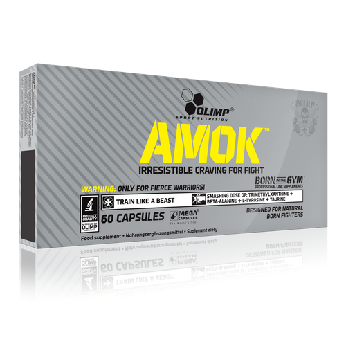 Suplement diety Olimp Amok to wysokojakościowa kompozycja wyłącznie najlepszych, starannie dobranych składników aktywnych, wśród których wyróżniamy takie perełki, jak beta-alanina, tyrozyna i tauryna, dzięki którym preparat skutecznie podnosi wytrzymałość i koncentrację, niezbędne w trakcie intensywnych ćwiczeń. Suplementacja Olimp Amok wspiera wzrost energii oraz mobilizuje do dłuższego i bardziej wyczerpującego treningu. Co więcej, suplement, dzięki dodatkowi ekstraktu z żeń-szenia oraz kompleksu witamin i minerałów, warunkuje stabilny przebieg procesów energetycznych zachodzących w organizmie, a także zwiększa zakres wysiłkowy, sprawiając, że każdy kolejny trening wykonujemy z większą satysfakcją! Olimp Amok to doskonała propozycja dla współczesnych wojowników, których celem jest wygrana i nieskończona siła! Produkt dedykowany osobom aktywnym fizycznie i sportowcom, a zwłaszcza trenującym sporty walki, jak MMA czy Kick-boxing. Suplement dostępny w postaci łatwych do połknięcia kapsułek, ułatwiających dawkowanie.