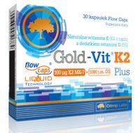 Gold-Vit K2 Plus to suplement diety w postaci kapsułek płynnych Flow Caps, zawierający wysoką ilość naturalnej witaminy K z natto, występującej w najbardziej przyswajalnej i najaktywniejszej formie – menachinonu-7 (witamina K2). Produkt uzupełniono w witaminę D (D3) w dawce aż 1000 j.m. Witamina K przyczynia się do prawidłowego krzepnięcia krwi, a także podobnie jak witamina D, pomaga w utrzymaniu zdrowych kości. Ponadto wit. D pomaga w prawidłowym funkcjonowaniu układu odpornościowego oraz przyczynia się do prawidłowego wchłaniania wapnia i fosforu.