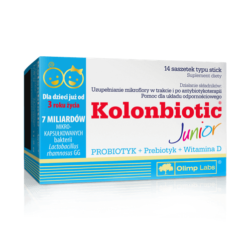 KOLONBIOTIC® Junior to synbiotyk dla dzieci zawierający specjalnie wyselekcjonowane kultury bakterii kwasu mlekowego Lactobacillus rhamnosus GG, w niezwykle wysokiej koncentracji aż 7 miliardów (7x109 CFU*). Dodatkowo zawiera też fruktooligosacharydy oraz składnik pomagający we właściwym funkcjonowaniu układu odpornościowego.