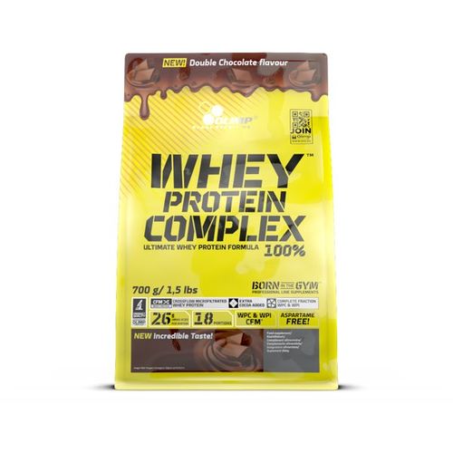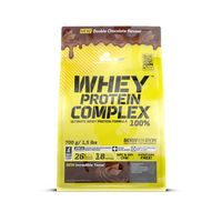 WHEY PROTEIN COMPLEX 100%TM Suplement diety. Wysokobiałkowy koncentrat w proszku o smaku Double Chocolate. Zawiera cukier i substancje słodzące.