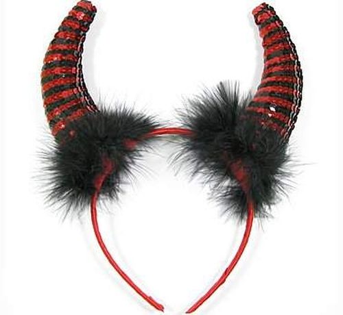 Plastikowa opaska obszyta czerwonym atłasem, rogi ozdobione cekinami w kolorze czarnym i czerwonym, obszyte czarnym puszkiem. Wysokość rogów - 16 cm. Rozmiar uniwersalny.