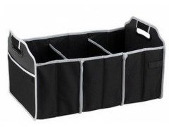 Torba, organizer, postawiony w bagażniku samochodu zmieści przydatne rzeczy, które często wozimy w aucie. Po złożeniu nie zajmie wiele miejsca. Ma praktyczny, czarny kolor i wygodne, mocne uchwyty. Organizer zawsze możesz mieć w pod ręką i rozkładać tylko w czasie potrzeby. Wymiary 52x32x32cm. Wykonany z poliestru. Zapakowany w opakowanie foliowe