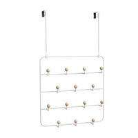 Organiezer Estique Multi wykonany został z metalu oraz drewna. Dzięki takiemu połączeniu UMBRA uzyskała niesamowity efekt, który sprawia, że rzeczy zyskują nie tylko dodatkowe miejsce do przechowania ale również wyglądają estetycznie. Wieszak można zawiesić zarówno na drzwiach jak i na ścianie, zastępując w ten sposób klasyczny stojący wieszak na ubrania czy torebki. Wieszak posiada 14 uchwytów, których końcówki wykończone zostały ciekawymi kulkami wykonanymi z drewna. Wysokość: 36
