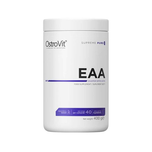 EAA z ang. essential amino acids to grupa organicznych związków chemicznych (aminokwasów), które są podstawowymi "puzlami" do budowy peptydów i białek. Nasz organizm niestety nie jest w stanie samodzielnie ich syntetyzować (produkować), więc tak ważnym jest aby dostarczać je wraz z prawidłową dietą lub z pomocą suplementacji. W składzie znajdziemy kompleks BCAA czyli trzech aminokwasów długołańcuchowych: Leucyny, Waliny i Izoleucyny oraz takie związki jak: Lizyna, Treonina, Fenyloalanina, Metionina, Arginina, Histydyna oraz Tryptofan. Kompleks OstroVit Supreme Pure EAA dzięki aminokwasom białkowym wspierają regenerację oraz procesy anaboliczne naszych komórek mięśniowych. Komponenty suplementu przyczyniają się do wspierania oraz same bezpośrednio uczestniczą w szeregu procesów życiowych naszego organizmu wspierając układ immunologiczny, nerwowy oraz trawienny.