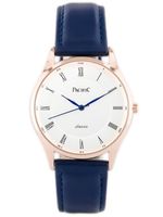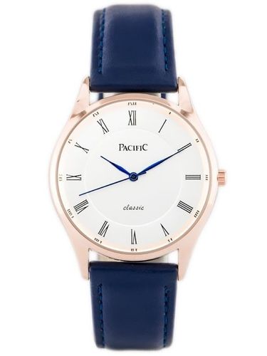 Kolorystyka: pasek w kolorze granatowym, koperta w kolorze rosegold, tarcza w kolorze srebrnym, wskazówki w kolorze niebieskim