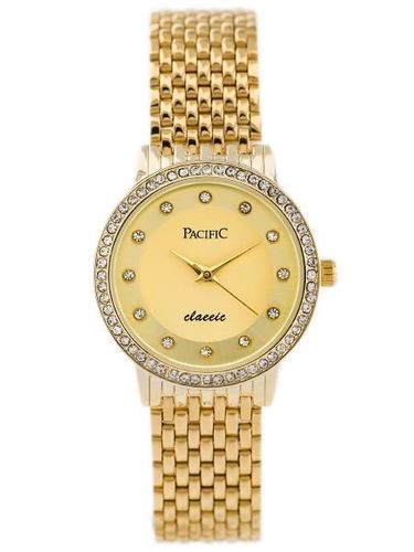Kolorystyka: bransoleta i koperta w kolorze złotym, tarcza w kolorze złotym, cyrkonie w miejscu wyznaczników godzin