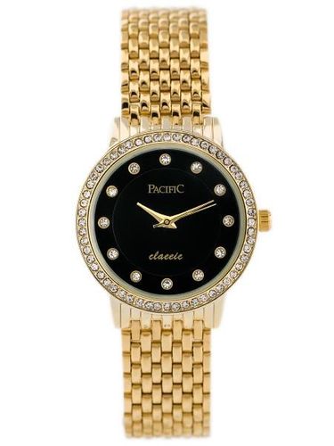 Kolorystyka: bransoleta i koperta w kolorze złotym, tarcza w kolorze czarnym, cyrkonie w miejscu wyznaczników godzin