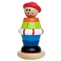 Wykonany z drewna uśmiechnięty klaun to edukacyjna zabawka dla najmłodszych polegająca na wkładaniu na drążek kolorowych kółek.