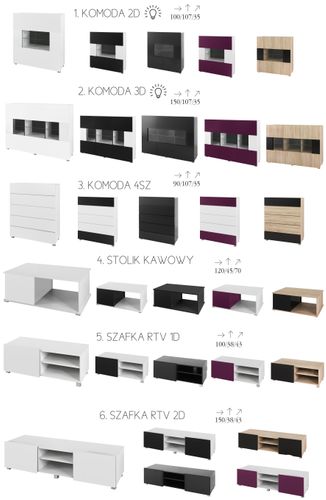 Fronty bez uchwytów, za to z cichym domknięciem, nadaje meblom estetyki i prostoty. Mimo, że meble z tej kolekcji są zachowane w stylu minimalistycznym, to projektanci nie szczędzili tutaj opcji kolorystycznych. Fronty mebli to gładkie i błyszczące powierzchnie. Dominujące kolory to czerń i biel, ale też ponadczasowy wzór naturalnego drewna i odważny, efektowny i intensywny fiolet.