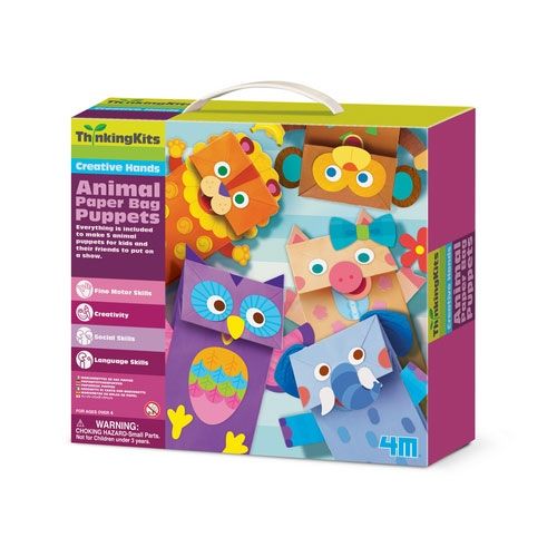 Papierowe Pacynki to kreatywny zestaw dla dzieci umożliwiający stworzenie kolorowych pacynek w kształcie najpopularniejszych zwierzątek. Samodzielnie wykonane pacynki przydadzą się dzieciom do znanej i lubianej przez nich zabawy w teatrzyk.Zabawa pacynkami w odgrywanie ról podczas teatrzyku to świetny sposób na urozmaicenie dziecięcych zabaw i przegonienie nudy. Rozwija wyobraźnię, kształtuje głos i doskonali mowę. Dodatkowo pozytywnie wpływa na pamięć i koncentrację dziecka.