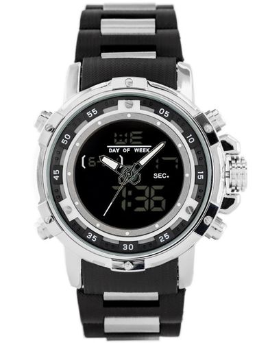 Zegarek analogowo - cyfrowy na bransolecie z tworzywa. Koperta metalowa. Mechanizm kwarcowy.